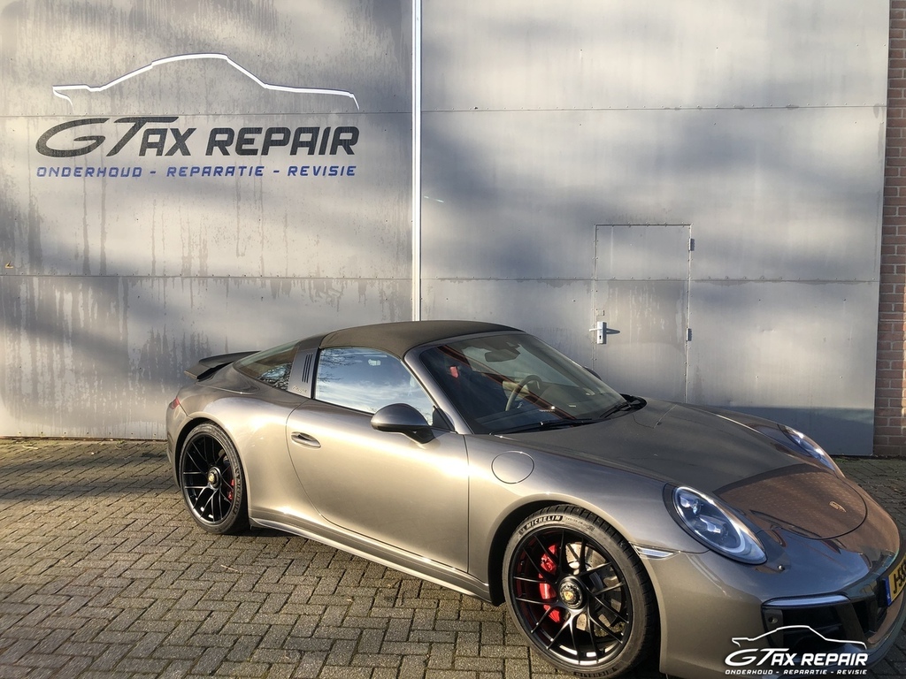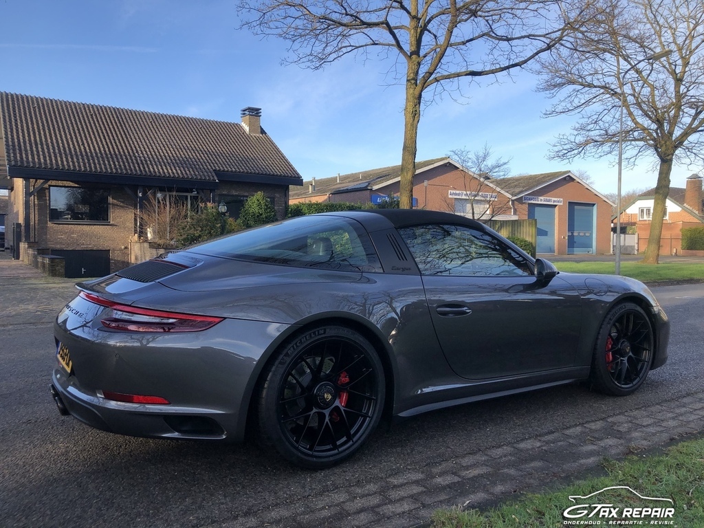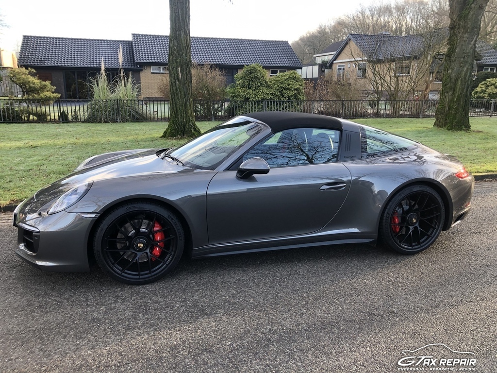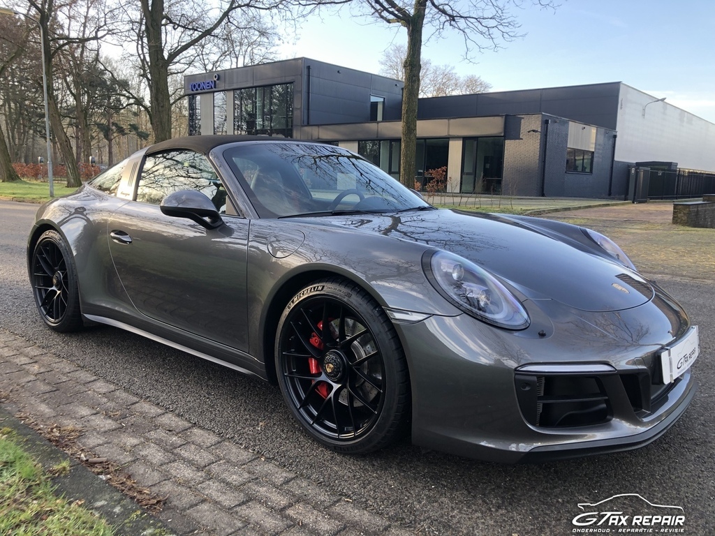 Te koop aangeboden in opdracht van klant Porsche 911 (991.2) 3.0 Targa 4 GTS in de cominatie van exterieur Grey met GTS-interieurpakket met stiksels in karmijnrood.
